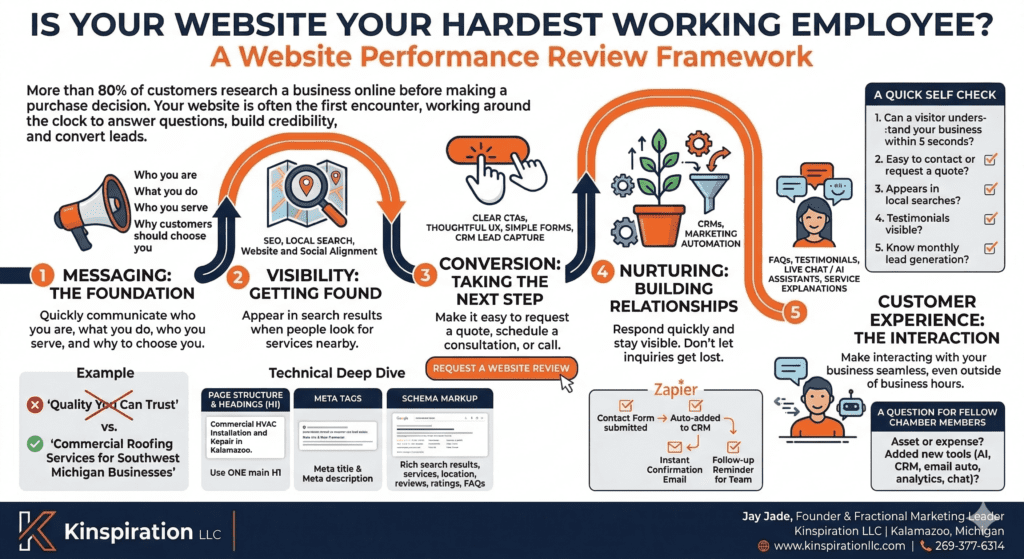 After more than 20 years working in marketing and business development with organizations such as Kellogg’s, Amway, and Spectrum Health, and now helping growing businesses through Kinspiration, I’ve found that high-performing websites consistently deliver five key outcomes.