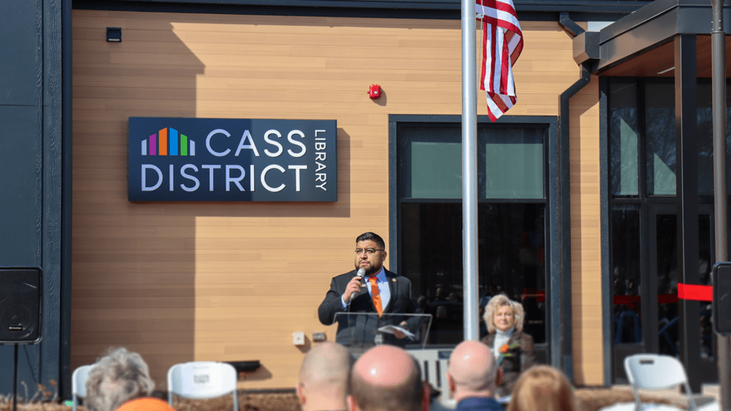 Arvin Delacruz, architect at Abonmarche, speaks at the grand opening of the Cass District Library – Edwardsburg Branch
